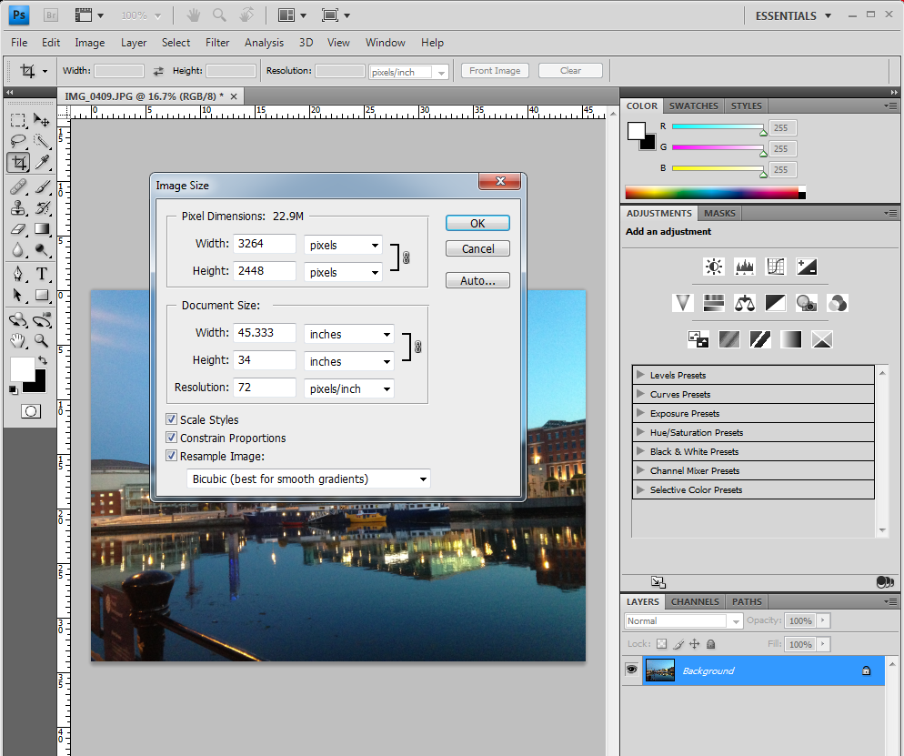 This may vary on different versions of Photoshop but ensure CONSTRAIN PROPORTIONS and RESAMPLE IMAGE are checked. Also, ensure BICUBIC is set to AUTO if available. In the example above, AUTO wasn’t an option on this version of Photoshop so BICUBIC (best for smoother gradients).